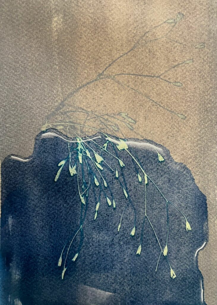 Passionnée d’arts plastiques depuis toujours, je m’inspire des cyanotypes* que je réalise pour créer des compositions végétales. Cette technique me permet de jouer avec les aspérités laissées par les empreintes des plantes qui donnent parfois des rendus presque abstraits. J’y ajoute souvent des formes géométriques pour créer un contraste avec l’aspect organique du cyanotype.